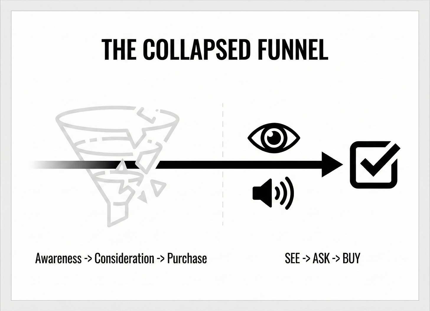 Walking down the street? See shoes you like. Point. Ask. Get alternatives under your budget. The funnel just collapsed from Awareness → Consideration → Purchase to See → Ask → Buy.